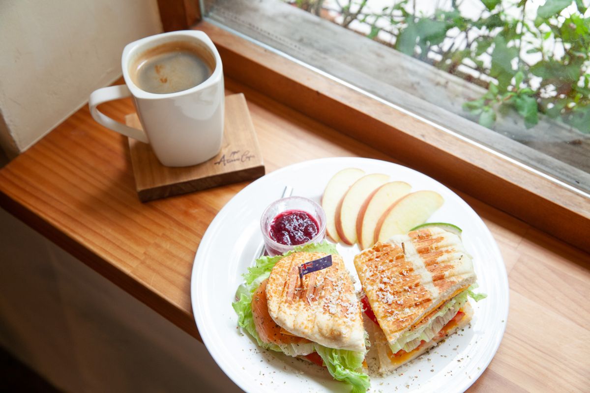 想來這裡吃點早午餐、輕食也沒問題!每一組都包含一份水果、優格和一杯美式咖啡,搭配主食一起吃超有飽足感~妞編輯主推「煙燻鮭魚熱壓軟法起司三明治」,軟法麵包嚐起來十分鬆軟但卻保有扎實感,豐富的生菜配上新鮮的煙燻鮭魚,與烤過的起司香氣,三兩下妞編輯就能吃掉一大個!