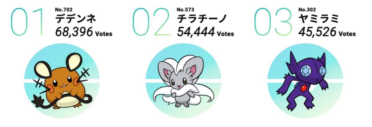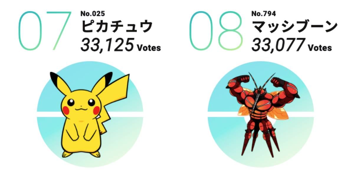 原先暫居第三名的「藤藤蛇」最後拿下第四名,第五名則是呆萌的「小磁怪」,長得有點厭世的「寶包繭」獲得了第六名。受到廣大粉絲喜愛的皮卡丘為第七名,第八名是外型有點帥氣、被認為是危險異類的「爆肌蚊」。