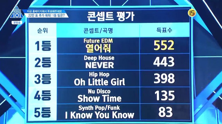 雖然第一名是由〈打開吧〉獲得,但真心覺得其他四組Concept也都表現地很好啊~不同特色的曲風和舞蹈,就像在看音樂放送節目一樣過癮!第一名Concept每人獲得2萬票,而得到團體第一名的成員可以得到10萬票。