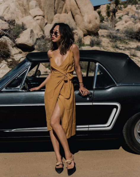 連華裔知名部落客Aimee Song,也選了一款開衩的棕色洋裝。