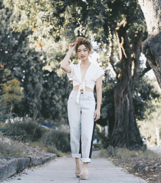 這股熱潮,也吹向世界各地,韓裔的部落客Jenn也搭上順風車,她選擇的是白色款式,露出她招牌的小蠻腰。如果妞妞們擔心深V會露出內衣,導致視覺上不太雅觀,也可以使用胸貼,或穿著前扣式的深V款內在美。此外,搭配長褲就不會覺得「露太多」,而給人不夠穩重的觀感。