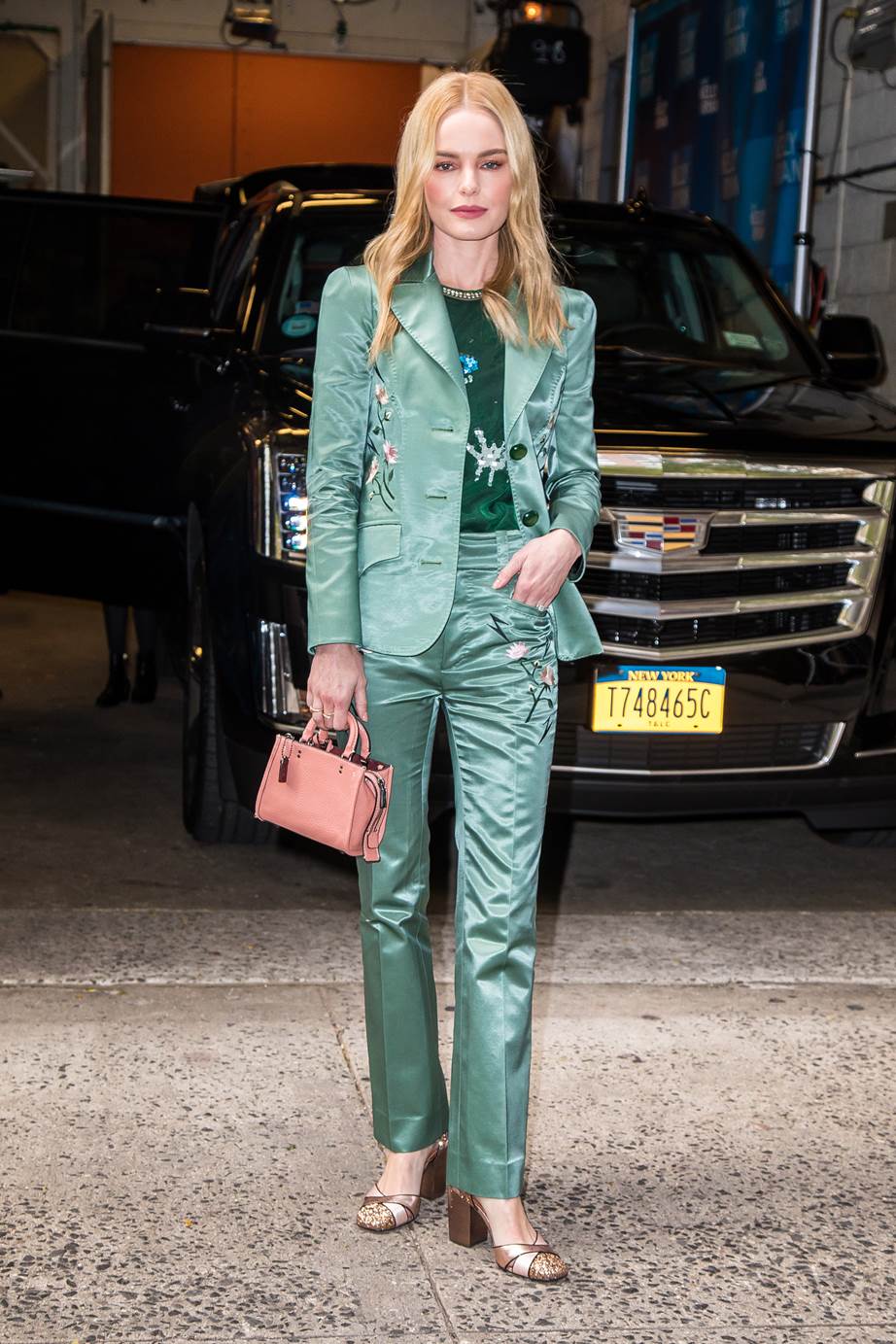 裙裝不是問題,當然褲裝也是時尚非凡!這次Kate Bosworth大膽穿上一深的綠,經典亮麗的絲綢套裝是COACH明年春夏的新品,隨意拿著粉色教練包,帥氣又俐落。