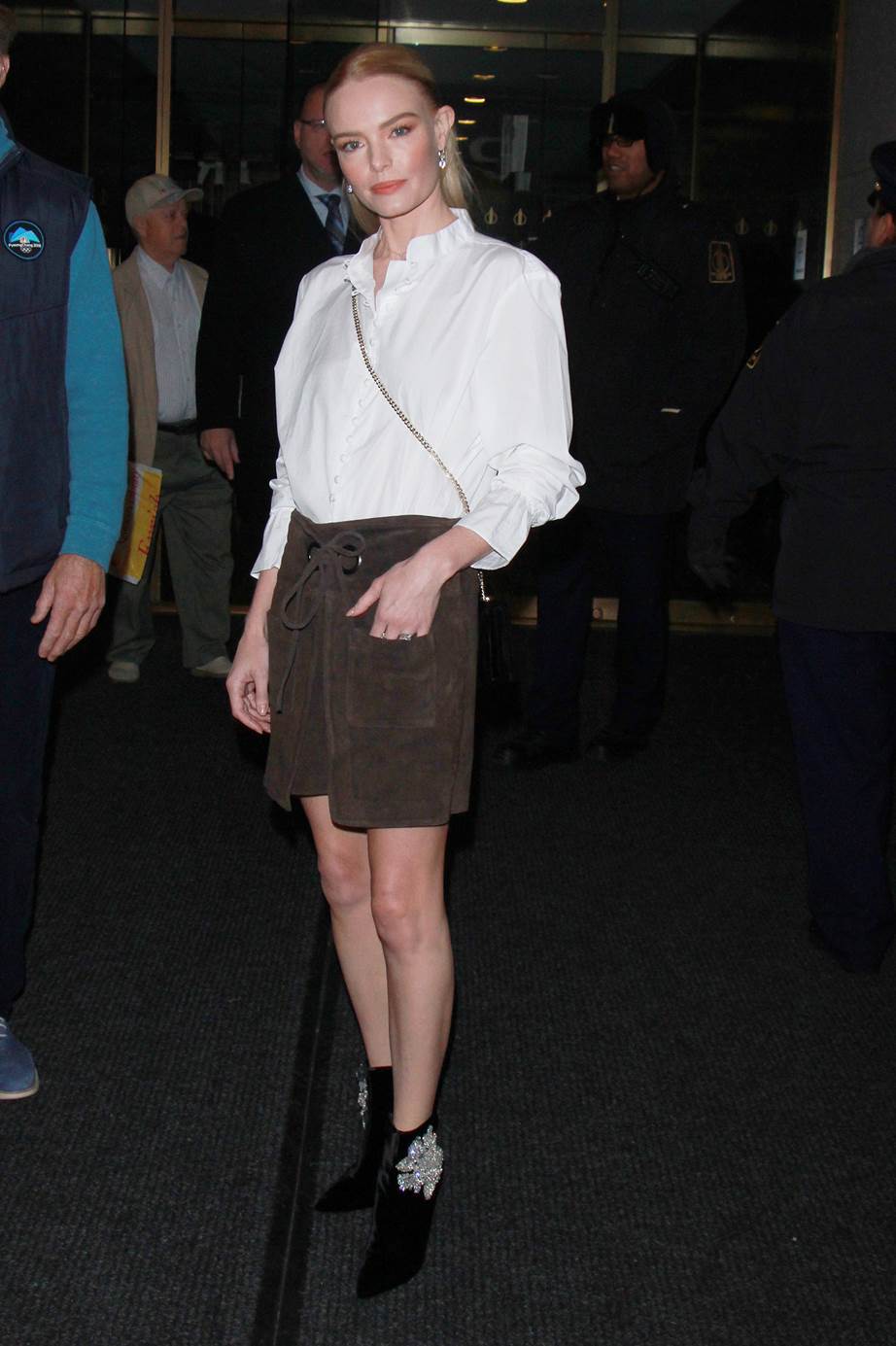 隨著場合不同的變裝,Kate Bosworth從華麗到休閒,每套穿搭都搭得恰到好處。晚宴完,她以一襲簡單的白襯衫和咖啡絨布短裙展現都會女子的隨性風,再次穿上出場率很高的Roger Viver戰鞋,不會因為率性而失了典雅。
