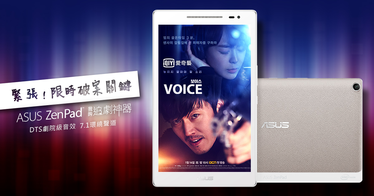 看完以上幾點,相信大家都深刻了解到,好的追劇工具帶你上天堂,壞的追劇工具只能讓你發脾氣,ASUS ZenPad我的追劇神器就讓妞兒們在追劇時免除以上那些煩惱,除了超強電力外,還有DTS劇院級音效+7.1環繞聲道,讓你在家追劇跟在電影院一樣享受;最棒的是首創的Tru2Life技術電視等級晶片效果,讓你清清楚楚看到歐巴身上每一根頭髮,絕對不會發生歐巴變歐巴馬的狀況!