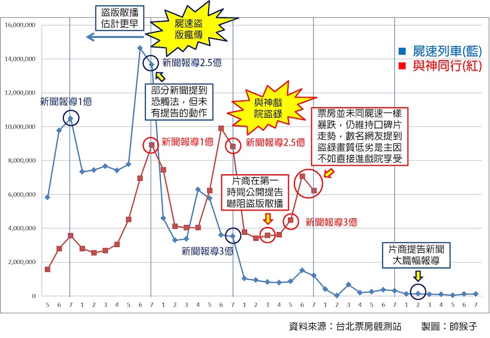 盜版風氣已久也無法根除,筆者一度認為盜錄事件會對票房產生影響,以票房結果來看,與神同行並未隨著盜版的流出和屍速列車一樣垮掉,而且還維持著漂亮的口碑電影票房走勢,眼看成為台灣影史最賣座的韓國片,讀者或許會有疑問,不是出現盜版了嗎?票房怎麼看起來沒受到影響?到底差別在哪裡呢,筆者透過新聞事件來分析一下: