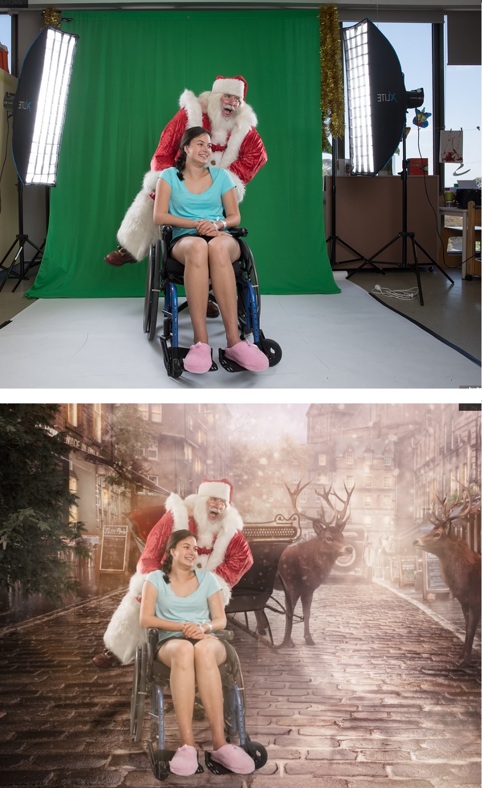 17歲的Brittany雖然半身不遂,但是經過攝影師Karen的專業後製技巧後,終於一圓夢想,和聖誕老人來到異國啦~