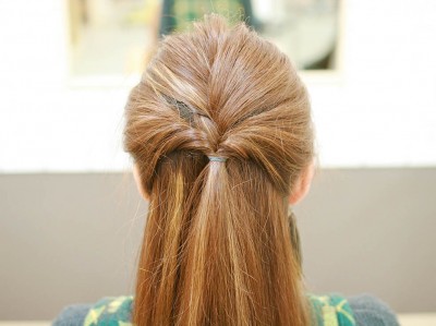 將頭頂位置的頭髮輕輕往上拉出,創造出自然的澎度,接著再用橡皮筋把三股辮綁起來~(如果剛剛第一步驟已經先綁好橡皮筋了,這邊就可以省略啦)