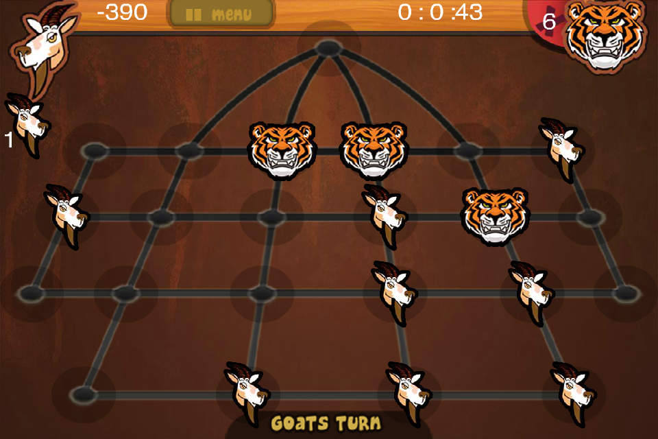 餓虎撲羊應該是這款遊戲最好的中文翻譯了,因為玩家的設定就是一隻老虎,目標是殺7只山羊贏得比賽,你可以通過跳過他們到另一個空位後殺死山羊,但是老虎不能跳過另一隻老虎,反之,如果老虎被山羊完全包圍而沒有地方跳躍,遊戲就結束囉~