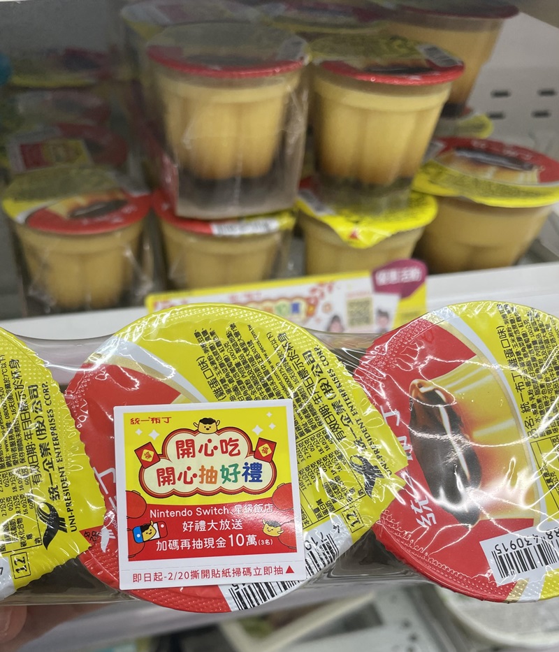 即日起至2月20日止,購買「統一小布丁三入組」,登入包裝上之活動貼紙序號,並登入相關資訊與發票號碼,即可立即抽Nintendo Switch(主機+遊戲片)、星級飯店住宿券、LINE POINT等精彩好禮,年後再加碼抽3名10萬現金紅包等你拿。今年就讓統一布丁用好口味及多項好禮陪大家生活步步甜,好運龍總來!