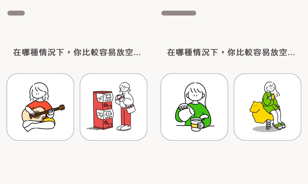 第一題使用了橘色和紅色來表現「彈吉他」及「抽扭蛋」兩個插畫,而第二題採用草綠色調繪製的「泡杯麵」和「乘坐搖搖馬」。