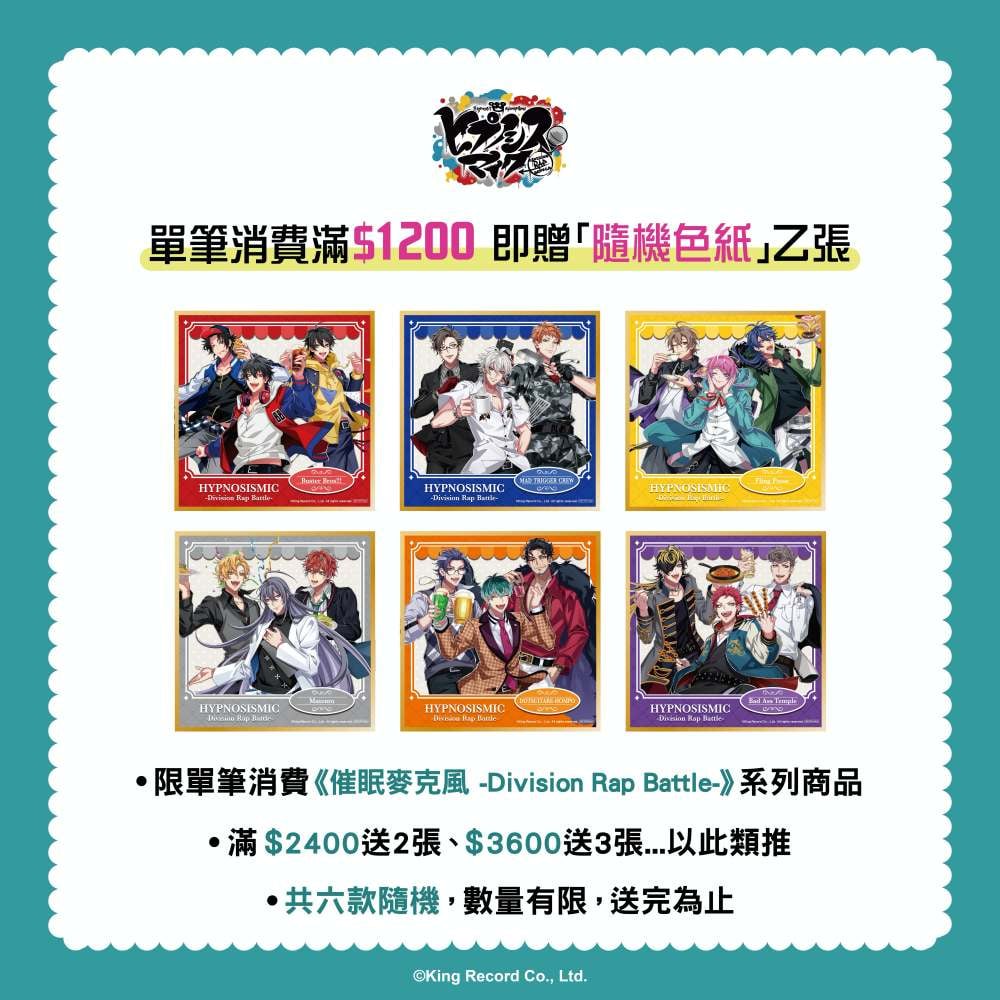只要於現場或官網預購《催眠麥克風 -Division Rap Battle-》7周年系列商品,單筆消費每滿1,200元,就可以獲得精美的「Division 色紙」乙張(共6款,隨機贈送)。滿額禮採累積贈送,數量有限送完為止!