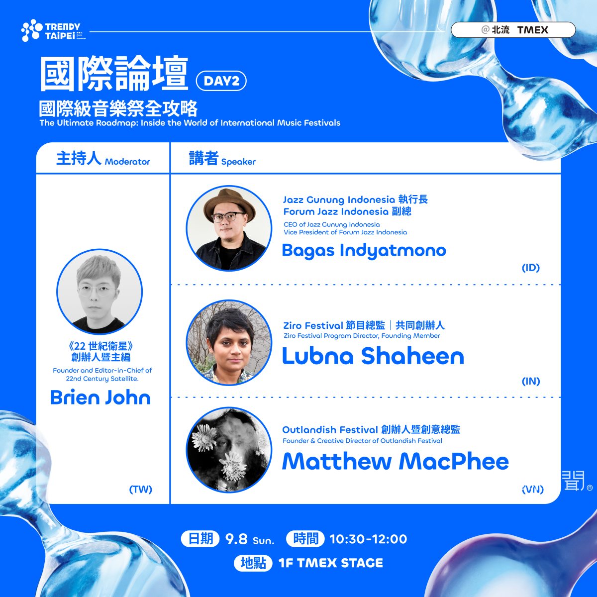 「國際級音樂祭全攻略」則邀請不同國家音樂祭策展人包括印度Ziro Festival的總監Lubna Shaheen、越南Outlandish Festival創辦人暨創意總監Matthew MacPhee、印尼Jazz Gunung Indonesia之執行長及副總Bagas Indyatmono分享策劃音樂節之初衷,也著墨在如何結合地方觀光資源,打造國際級音樂盛會,各場主題皆精彩可期。
