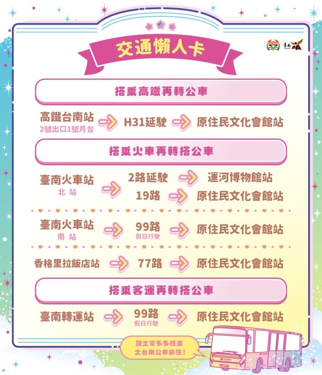 官方也釋出「交通懶人卡」,不管是要「高鐵再轉公車」、「火車再轉搭公車」還是「客運再轉搭公車」都有詳細的路線資訊,同步提供安平遊憩碼頭周邊停車場和公車站位圖,建議妞妞們多搭乘大台南公車前往!