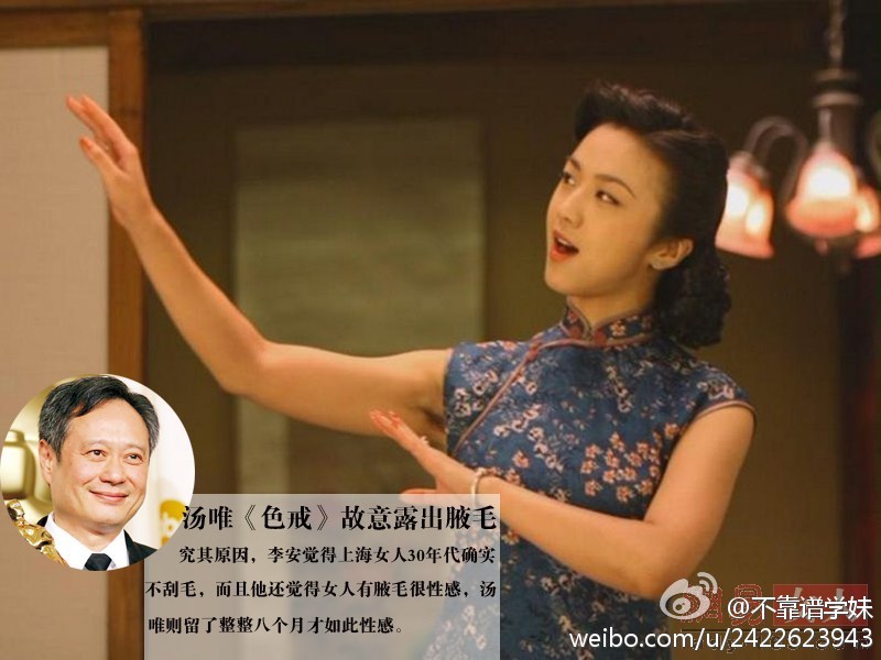 有網友也將電影《色‧戒》女主角湯唯露出腋毛的畫面上傳,旁邊也放上附註說明當時的女人確實是不刮腋毛的。