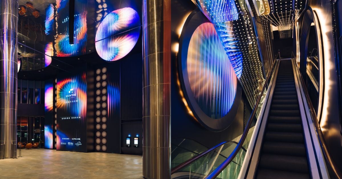 大巨蛋秀泰影城進駐在台北大巨蛋園區影城棟2至5樓,影城是由擁有飯店設計背景的魏沁如(Judy Wei)親自操刀,以六〇年代的歐普藝術(Optical Art)為靈感,整體以「圓」為設計核心。不論是天花板的燈飾、牆面的線條還是走道的幾何圖案,都能感受到光影與圓形交錯的律動感。整個空間在簡約中帶點俏皮,走進去就像誤闖進一場關於「光與影」的藝術展。
