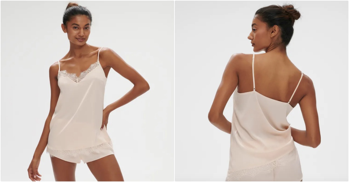法國品牌SIMONE PÉRÈLE西蒙佩兒的春夏新款太仙了吧?緞面結合蕾絲以及小V領,充滿法式風情的無袖上衣採用的是「淡雅的櫻花粉色」,下擺細節處也有精緻蕾絲點綴,搭配上以透膚蕾絲裝飾在兩側的緞面短褲,微微的透肌感,不刻意賣弄風情,自然流露出性感女人味~