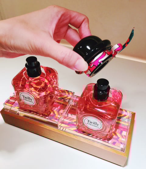 這瓶愛馬仕的新香水實在是太!可!愛!方形的瓶身,上面彷彿帶著一頂黑色小圓帽,(其實人家是馬車前燈,不是小圓帽啦XD)最吸睛的地方,就是繫在中間那條彩色Twilly小絲巾。