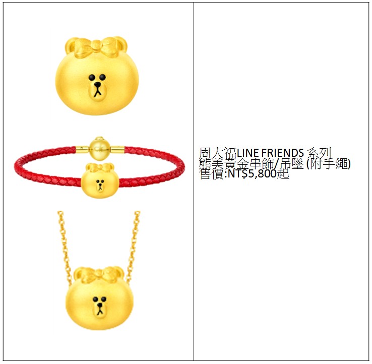 在台灣擁有超高人氣的LINE FRIENDS與周大福攜手推出LINE FRIENDS系列,以黃金材質打造出溫和金黃色光彩,不只可愛更增添了收藏價值,全系列串飾商品皆可搭配手繩佩戴也可以當做項鍊,多樣化的穿戴方式更能展現自我風格!