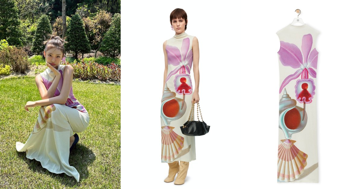 你永遠可以信任LOEWE的設計師!這款Maruja Mallo的直筒洋裝採用羅紋彈力棉織成,印花靈感源自西班牙超現實主義畫家 Maruja Mallo 的Living Nature系列,結合了海陸元素的設計,Aespa的寧寧穿上它更是自帶古典美人氣息!是今年早秋的注目款單品。