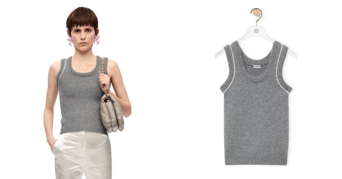 先前有介紹過LOEWE夏季的小標誌背心,已成為不少時尚名人默默收藏的款式,秋冬的Tank top in cashmere and mohair同樣很實搭,採用羊毛和馬海毛製成,手感和外觀都較為厚實,撞色的滾邊設計和方領造型,在基本的款式中營造一些巧妙的安排~