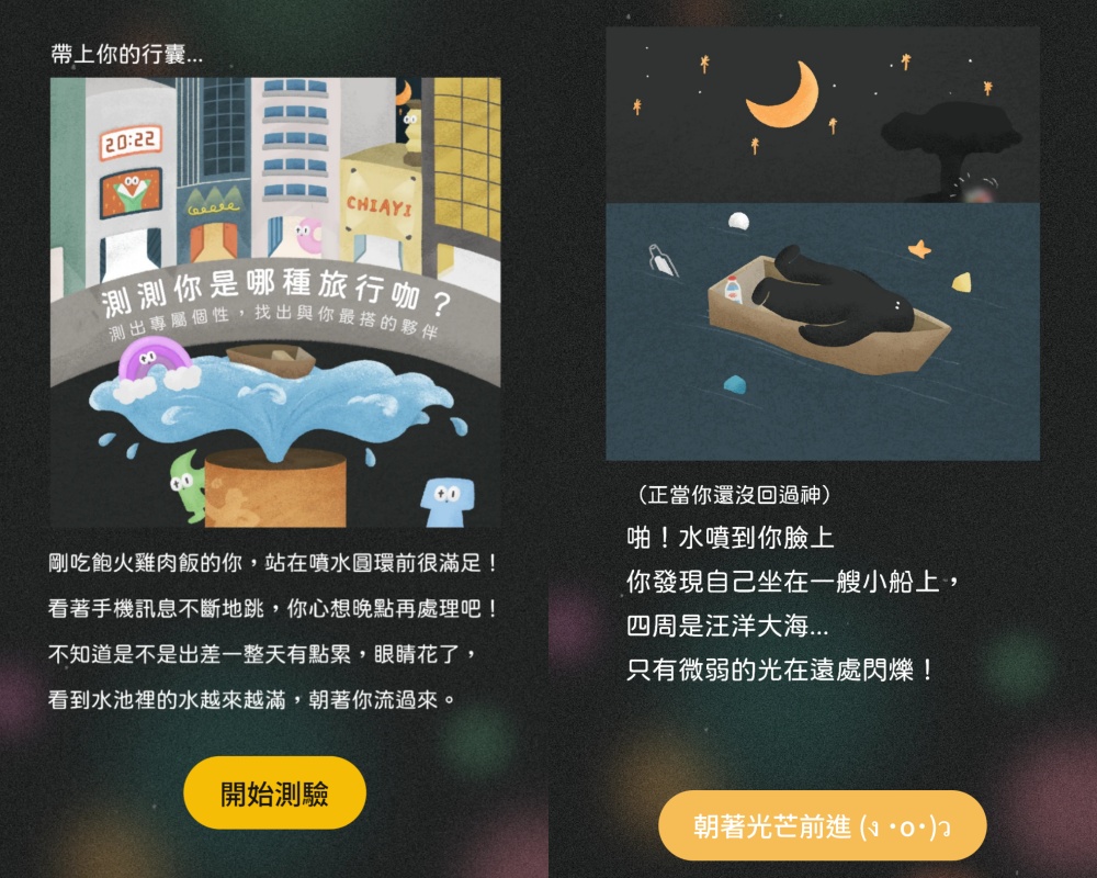 相信妞妞們也會想和給力度滿點的旅伴一同出遊吧(笑)。在一趟旅行中,若是能遇上默契合拍的旅伴,不僅能造就美好回憶,也能為自己省去旅行當下會遇上的麻煩事!這回妞編輯也要來跟大家介紹,由「嘉義心旅程」所製作的心理測驗,只需回答10題就可以測出你的專屬性格,並分析你在旅行時是哪一種類型的人喔!