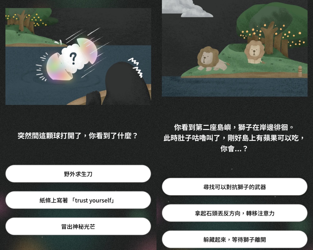 緊接著,這顆發光球突然打開了!?而在打開的當下,妞妞們要選擇「你看到了什麼?」來到第四題,船也持續漂泊至第二座島嶼前方,「在這座島上除了蘋果可以充飢之外,也充滿了徘徊在岸邊的獅子」,這時的你又會怎麼抉擇?