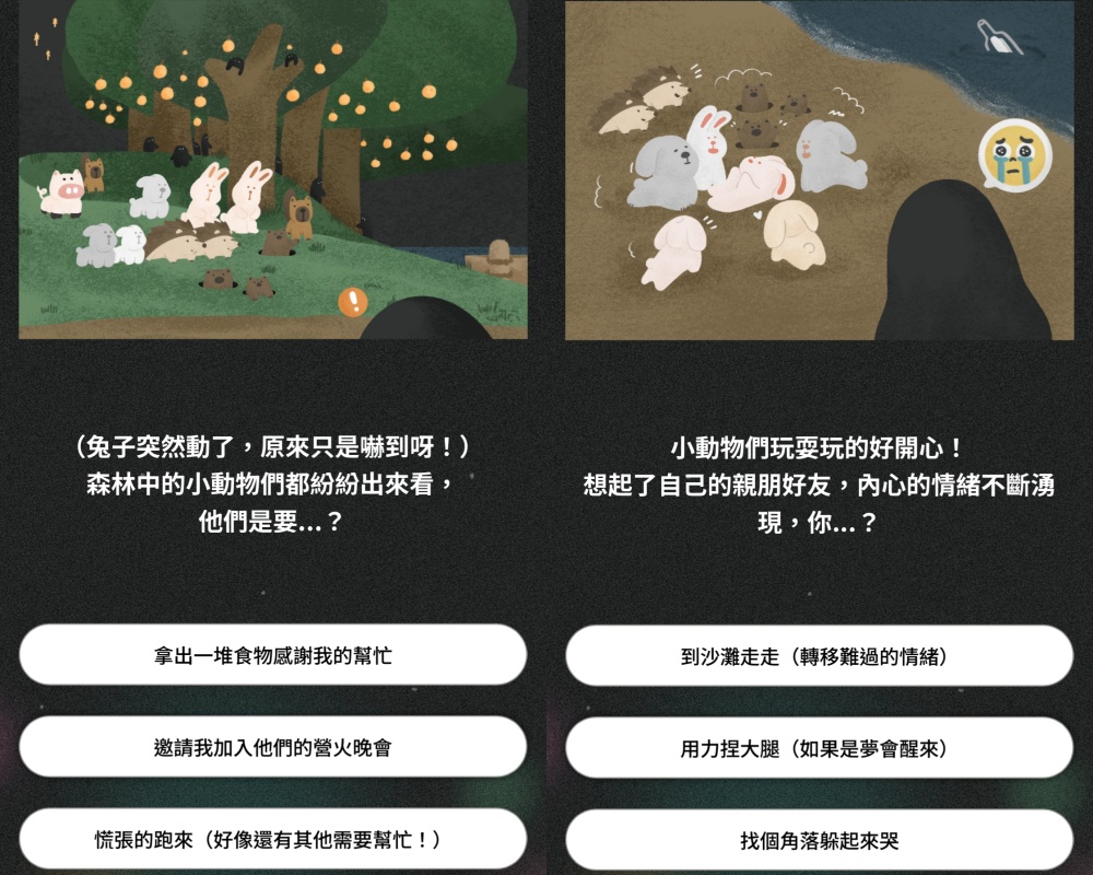 就在你試圖幫助兔子時,小兔子竟動了一下,而森林裡的動物也紛紛現身!妞妞們是否也覺得「牠們要邀請你參加營火晚會」呢(笑)。看著動物們開心地玩耍,也讓你回想起了自己的親朋好友,這時的你會「用力捏大腿」或是「找個角落躲起來哭」?