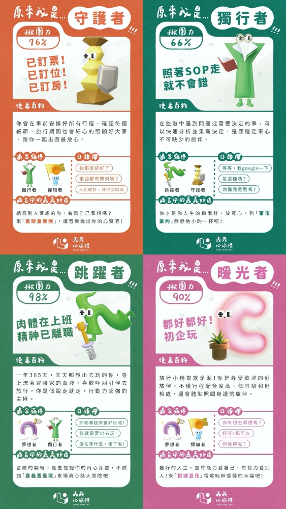 完成第10題之後,測驗結果也隨之揭曉!上頭除有自己的專屬性格類型、多少%的揪團力之外,還會顯示「使者百科」、「適合旅伴」、「旅行時的口頭禪」,以及「適合你的嘉義好店」,而類型也包含了「揮旗者」、「守護者」、「跳躍者」、「獨行者」、「暖光者」、「夢想者」等6種,快揪好友們一起來測看看吧~
