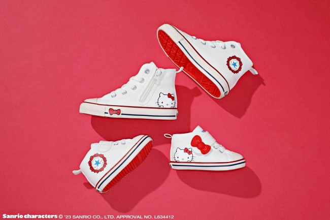 這麼可愛的長壽小白鞋,不擁有怎麼行?以All Star (R) HI為主要鞋型,搭配奶油白配色打造,乍看依舊簡約、百搭的白色高筒帆布鞋,Hello Kitty拿著蘋果出現在鞋側,另一側的招牌星星LOGO「被紅色蝴蝶結浪漫圍繞」,細節處點綴紅、藍雙色超時髦,同時還推出「Kitty大頭趴著賣萌」的兒童版本,最強母女鞋必須一組收!