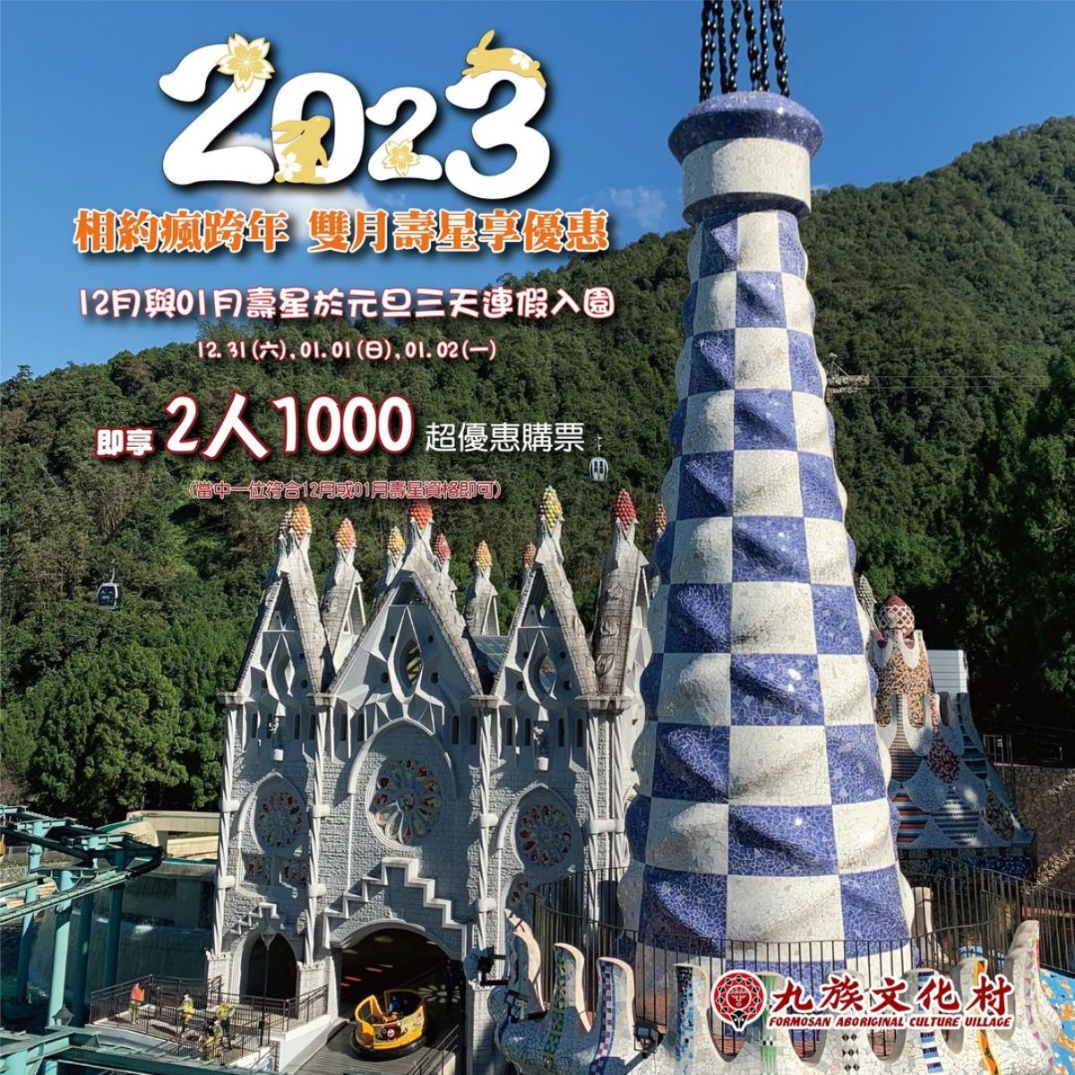 生日寶寶們快來九族文化村相約跨年!元旦連假「九族文化村」推出雙月壽星優惠,12月和1月的壽星於2022年12月31日至2023年1月2日入園,即享2人1,000元購票優惠,2人當中只要一位符資格即可享優惠喔~