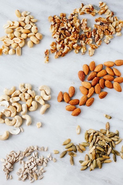 堅果富含高蛋白可以延遲飢餓感,豐富的纖維更可以增加飽足感,被視為最佳的減肥零嘴 !不過因為油脂含量高要避免攝取過量,一天30克(約3小匙)即可。杏仁、花生、南瓜子、腰果、核桃、葵瓜子、開心果等都是常見堅果類食物喔~