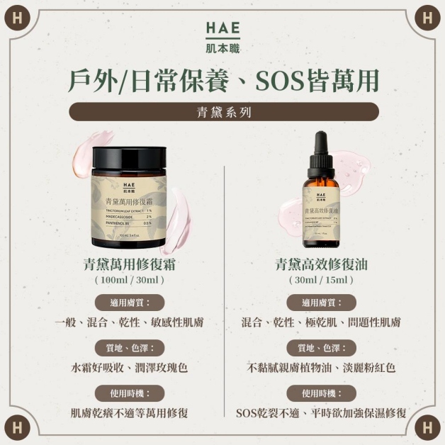 有別於傳統中醫師或坊間製作青黛膏,『HAE肌本職 青黛萬用修復霜』以專利萃取技術保留「青黛」有效活性「靛玉紅」並濾除雜質,產品呈淡玫瑰親膚輕盈光澤、不易染色且具潤飾膚色效果。『HAE肌本職 青黛萬用修復霜』為獨特水霜質地,質地清爽水潤不油膩容易吸收,針對肌膚不適、痘痘瑕疵、乾燥而引起脫屑、泛紅、搔癢或特殊美容後修復均有顯著功效,一年四季從嬰兒到成人肌膚、臉部及身體肌膚皆可使用。