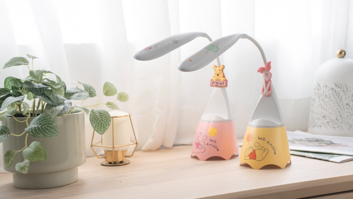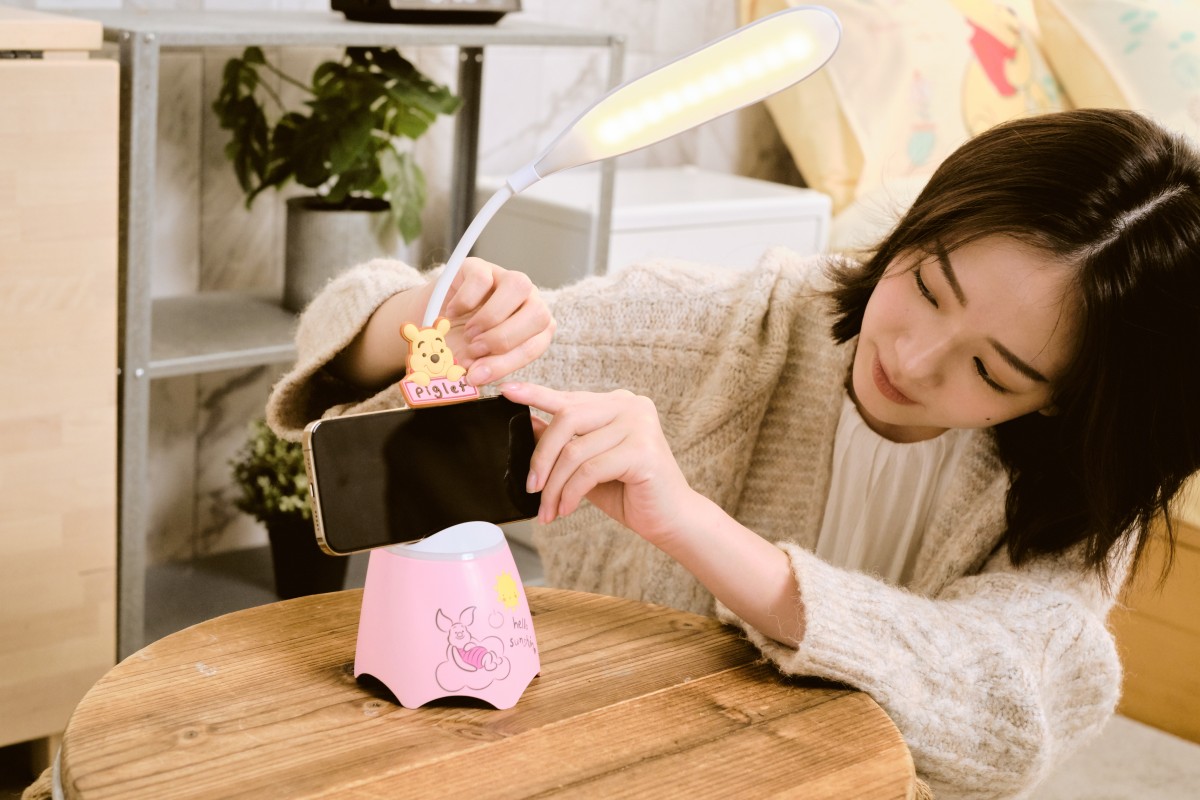 「LED燈藍牙音箱」則推出維尼及小豬兩款設計,具LED檯燈、藍牙音箱以及手機架三種功能,可切換黃、白燈光,可依需求調整亮度,彈性燈頸可調整照明角度,內建高效能電池,飽電可用4至6小時,辦公室午餐與宅家追劇必備。