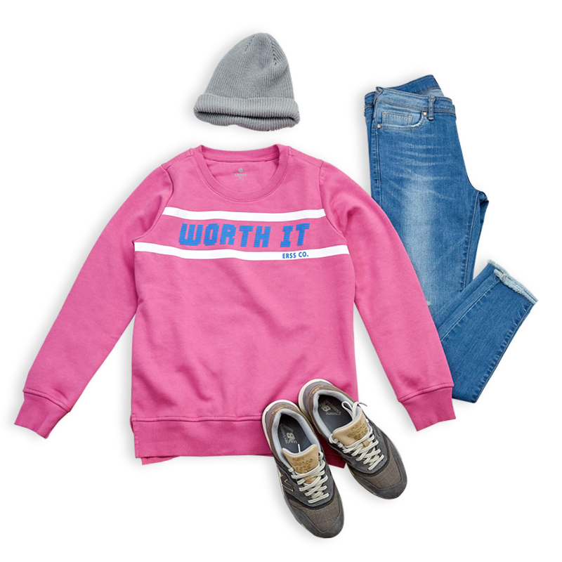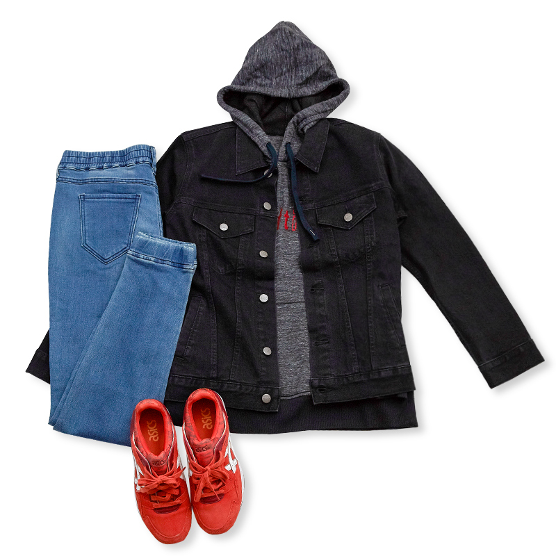 簡約俐落─內搭帥氣的連帽T恤,展現帥氣感之餘,統一色系後的和諧感,讓整體看起來簡約俐落。搭配定番丹寧長褲,以及亮色系Sneaker,路上最搶眼的女孩就是妳!