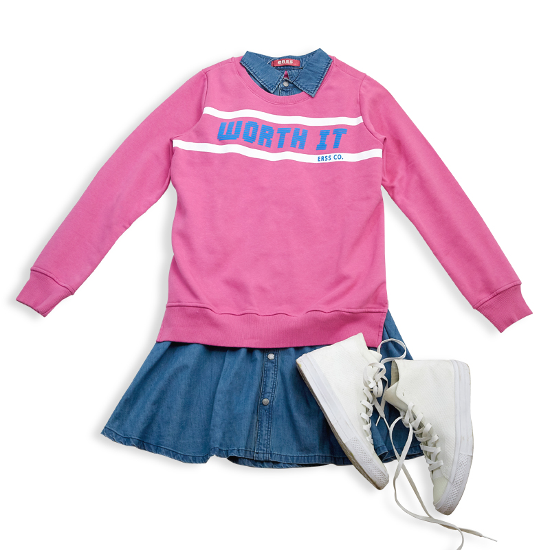 甜美女孩─為造型增加層次感就多搭一件襯衫在裡面吧,如果是附有領子的洋裝那就更棒了!彷彿重新打造了新單品,甜美丹寧裙跟字母上衣超合拍,搭配高筒休閒鞋,展現好感度一百分的風格。