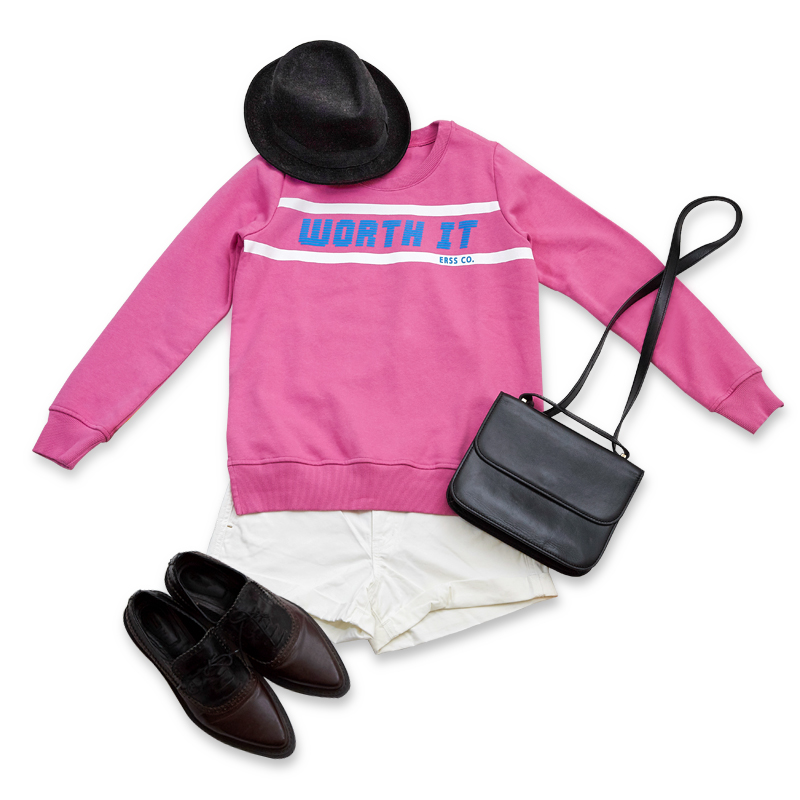 英倫時髦─沒想到休閒字母上衣也能有英倫風面貌!搭配簡單的白色短褲,配件全面使用黑色系單品:紳士帽、雕花皮鞋、皮革小包,讓氛圍轉變成優雅的樣貌,實踐單品多樣化的目標吧!