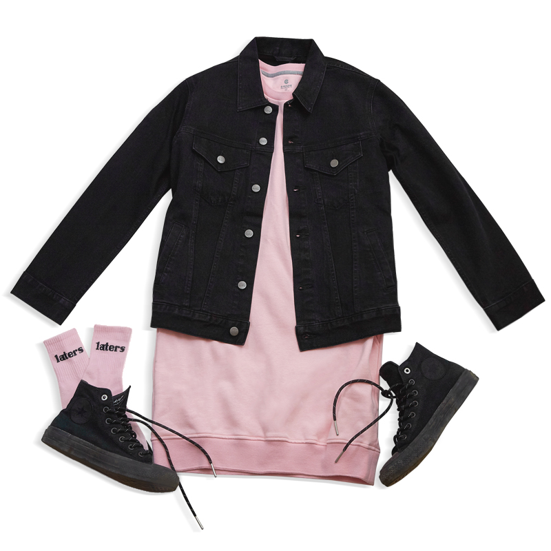 個性女孩─粉紅色的長版上衣總是過甜美?沒關係,就用黑色夾克&黑色Sneaker來做收斂,降低甜美感同時提升帥氣度,打造最有態度的時髦Look吧!
