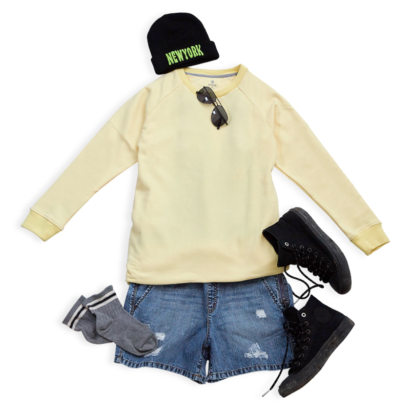 美式休閒─把休閒棉T當外搭,降低俏皮的感覺,營造出休閒運動的風格。搭配字母針織帽、條紋短襪以及復古風格的高統帆布鞋,妳即將成為美式風格的穿搭高手呢!