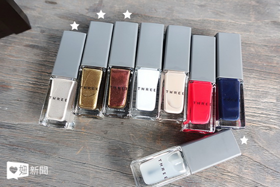 指彩部份,本季不僅玩色,也大玩質感。從金屬光澤、色感清晰的純色甚至是霧面質感都有。而指彩的亮點,非THREE首次推出的霧面護甲油「魅光指彩(霧采)」莫屬!