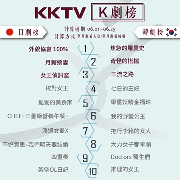 擁有亞洲線上最豐富戲劇OTT影音平台KKTV,6月K劇榜首度揭曉!跟播韓劇因劇情進展快、主演卡司強大,加上網友討論度高,紛紛上榜,如《奇怪的搭檔》、《三流之路》、《七日的王妃》等劇。其中最特別的是已於5/30播出完結篇的《焦急的羅曼史》,本部長成勛魅力持續發燒,劇迷想一次完食男女主角之間的粉紅火花,播出完結後更引來另一波收視高峰。日劇則是以勵志愛情劇《外貌協會100%》奪冠,變身前後的差異的趣味性,以及生活、工作、另一半的選擇難題,增加全劇可看性,女主角桐谷美玲的生動演技更備受網友喜愛,一舉擊敗過去日劇榜常勝軍《月薪嬌妻》,成為6月K劇榜日劇冠軍。