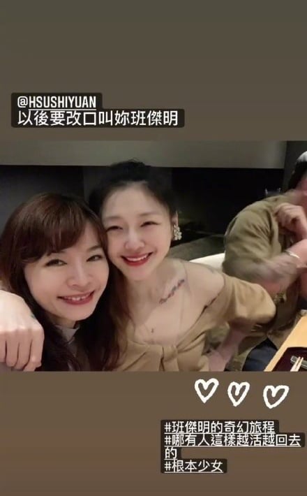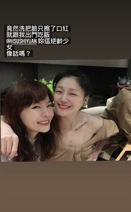 鮮少使用社交平台的大S在6日凌晨轉發與經紀人的合照,經紀人大讚大S只是洗把臉,塗了口紅就出門簡直是「逆生長」、「根本少女」等,而照片中今年45歲的大S素顏肌膚白皙、容光煥發,笑得非常燦爛,果然不負「美容大王」的封號,不過比大S完美素顏更搶眼的就是大S在鎖骨多了一排彩色的新刺青,根據經紀人的透露,這與具俊曄脖子上的刺青文字相同,是他們夫妻兩人在過去在一起時都很喜歡的一首英文情歌,兩人在婚後也決定將這段定情歌詞刺在身上!