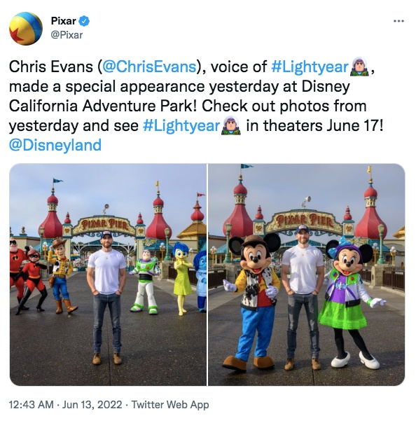 克里斯伊凡為電影《巴斯光年》(Lightyear)親自獻聲配音,隨著電影上映克里斯伊凡也開始了宣傳行程,第一步當然就是前往玩具大本營迪士尼樂園,一身休閒裝扮的克里斯伊凡胡迪、巴斯光年、超人特攻隊還有米奇米妮等經典動畫角色人物一同合影,合身的T恤完美呈現結實強壯的胸肌線條,隨著皮克斯釋出這組照片後,照片下網友因為克里斯伊凡兩張照片中完美的挺拔身型體格懷疑這組圖是合成的,並開始了留言P圖之亂~(一言不合就玩起來了)
