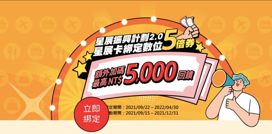 星展振興計畫2.0 星展信用卡綁定數位振興5倍券,額外加碼最高NT$5,000回饋。新戶累積刷卡一般消費金額達3,000元,完成註冊《星展Card+》App, 申請信用卡電子對帳單,完成以上任務可享2,000元刷卡金回饋。