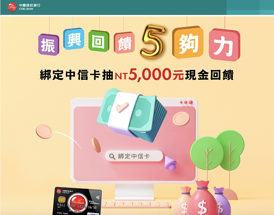 綁定中信卡就有機會再抽中NT5,000元刷卡金,多元回饋最高15%。