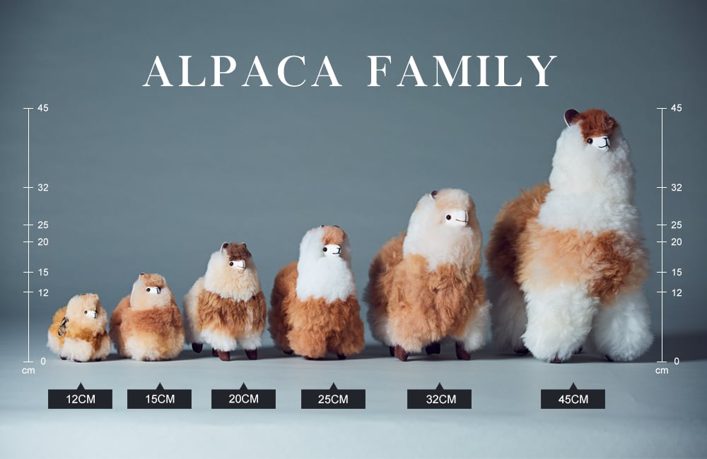這系列的娃娃從最小掌上型12cm、15 cm、20cm,到擁抱型25cm、32cm、45 cm,甚至是觀賞型50cm款都保留了羊駝的比例與表情,呆萌的神韻配上蓬軟的毛髮,真的輕易擄獲大人小孩的心。也因為是真實毛髮製成,在運送過程中難免會因為擠壓而變形,但只要抓住腳腳部分輕輕甩動,就又能重新獲得蓬蓬的羊駝囉~