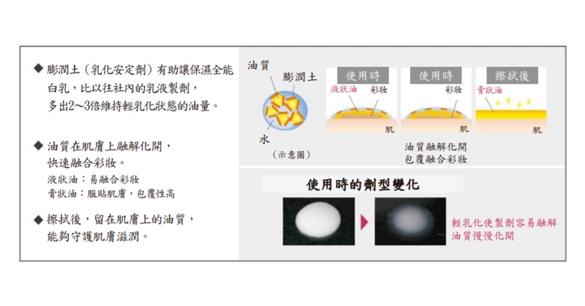 ・含有玻尿酸(保濕)的水潤膜包覆濃密油質,形成不黏膩的純白色脂乳。
