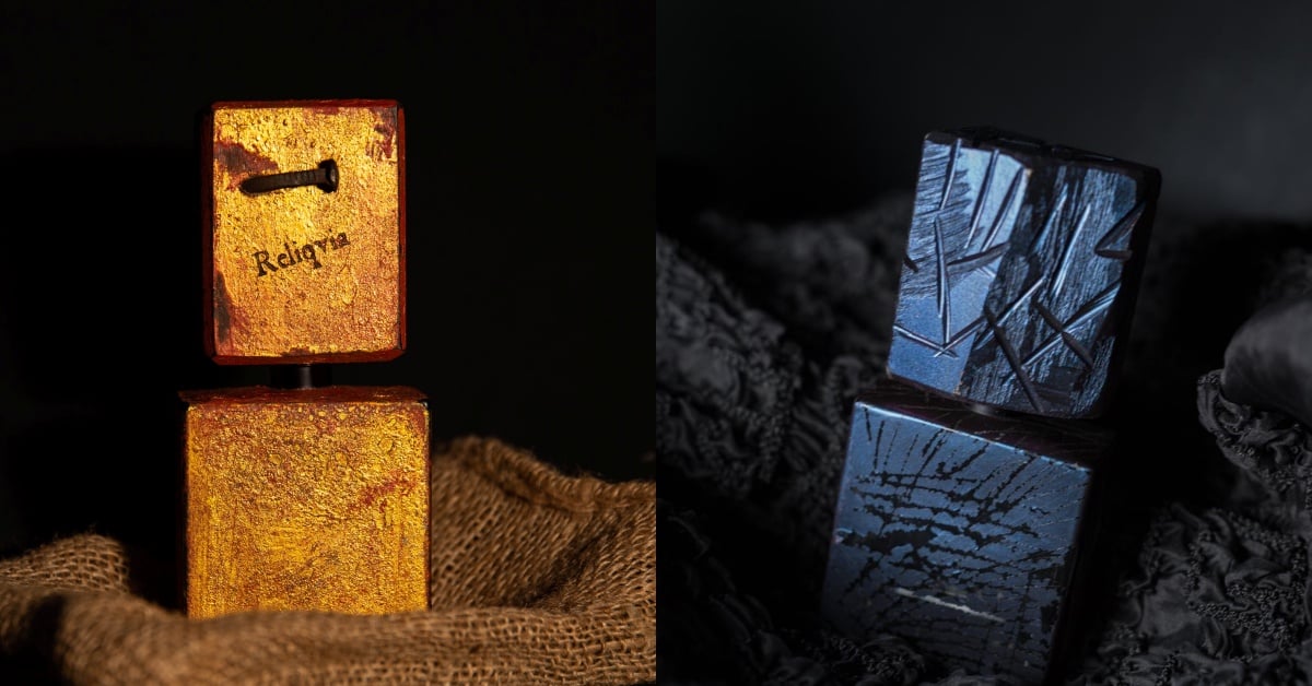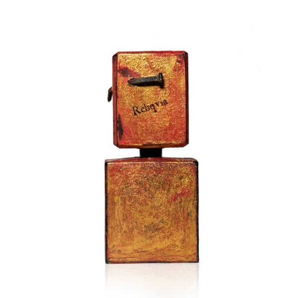 以義大利塞尼加利亞的十字架教堂為靈感,純手工燒製香水瓶身,塗刷金黃色的顏料,敲進陳舊的釘子,最後烙印上香水名「Reliqvia」,是Filippo Sorcinelli在社群上高頻率分享的愛作。猶如身處陳舊古老的教堂,因歲月的侵蝕變的斑駁凋零,木造的浮雕也因水氣腐朽,一切事物都鋪上一層厚厚的灰。肅穆且寂靜的木香盤旋於此,還有隱約殘留百年前燃燒的焚香,微量的辛香料並不突出,但讓木香更顯乾燥,時空猶如靜止一般,停在最莊嚴的一刻。