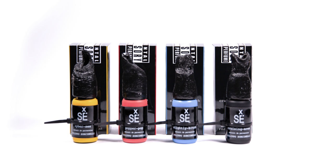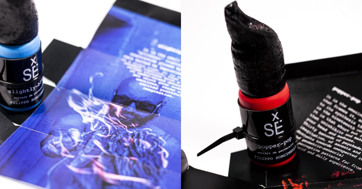 Filippo Sorcinelli驚駭新作–心解放系列,全手工細膩製作,瓶身綁上黑色自鎖式束帶,用高溫溶解瓶蓋呈現自然融化的不規則形狀,完美詮釋強烈的工業風包裝。包含四款風格迥異、鮮艷正色的滾珠型香水,命名曖昧而挑逗,渴望透過氣味打破社會模式的刻板印象,以前衛的主題探討多樣化的可能性。