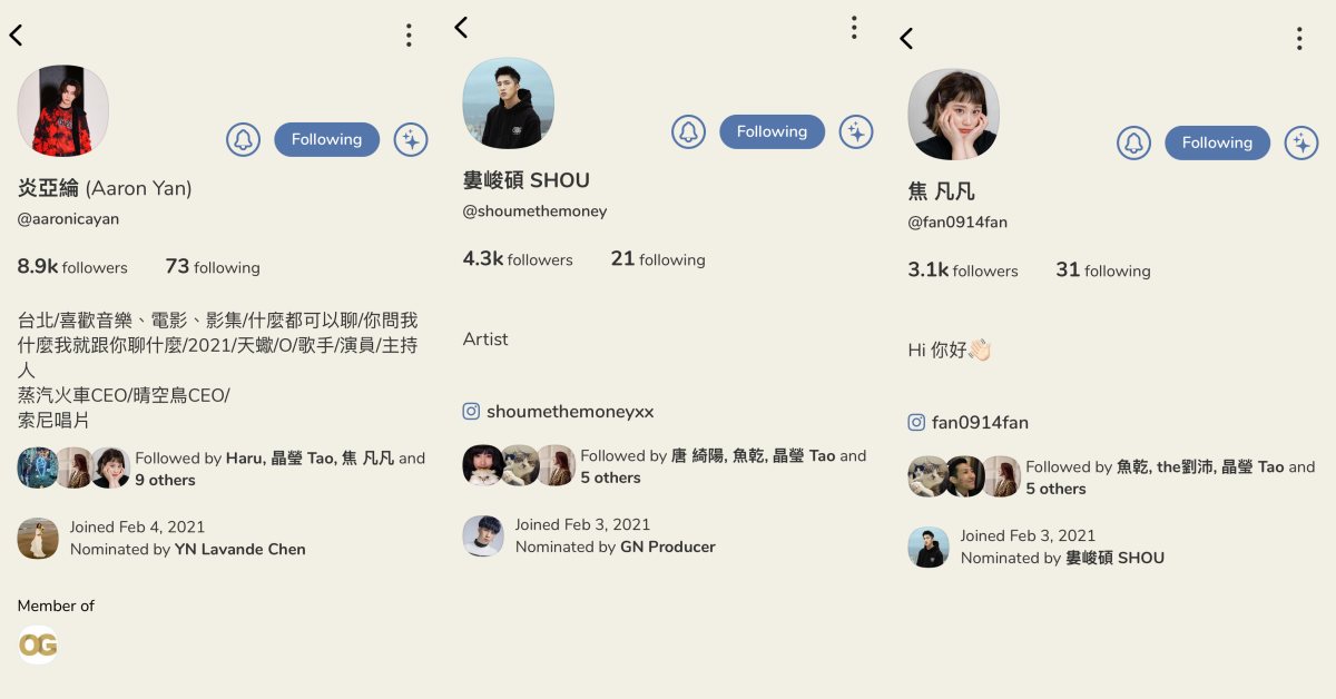 孟耿如、李千娜、小甜甜、王子邱勝翊、ØZI、韋禮安、呂士軒與LULU也已成為用戶,相信屆時除了聽他們分享工作趣事之外,或許也有機會聽到這幾位歌手在線上熱唱。(好期待)