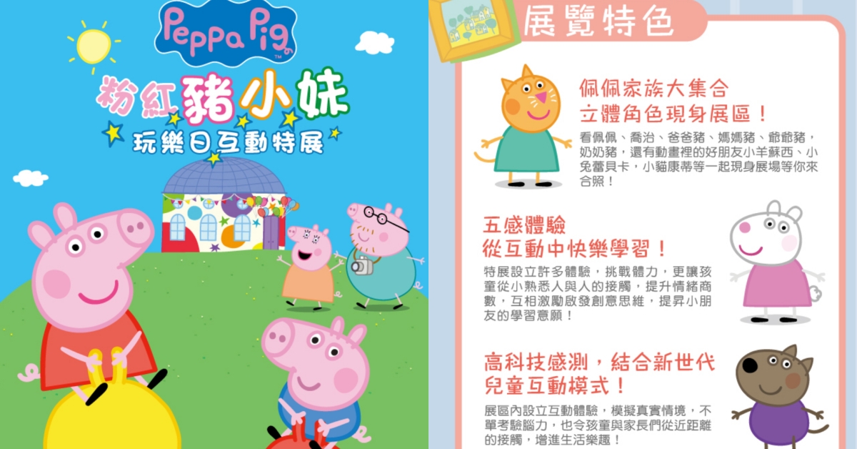 佩佩家族大集合,立體角色現身展區!看佩佩、喬治、爸爸豬、媽媽豬、爺爺豬,奶奶豬,還有動畫裡的好朋友小羊蘇西、小兔蕾貝卡,小貓康蒂等一起現身展場等你來合照!五感體驗,從互動中快樂學習!特展設立許多體驗,挑戰體力,更讓孩童從小熟悉人與人的接觸,提升情緒商數,互相激勵啟發創意思維,提昇小朋友的學習意願!